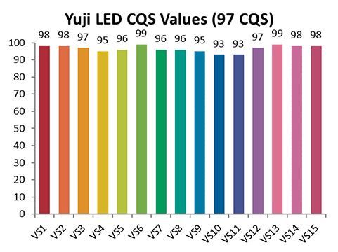 CRI is merely an index value that considers 8 color samples. Though not included in the calculation of CRI, the CRI R9 special test color sample index is typically very low in blue-chip LED lights, reflecting the fact that they render red colors particularly poorly. Yuji LED lights have Ra values all above 90, and show superior testing results for the recently developed CQS (Color Quality Scale) as well.