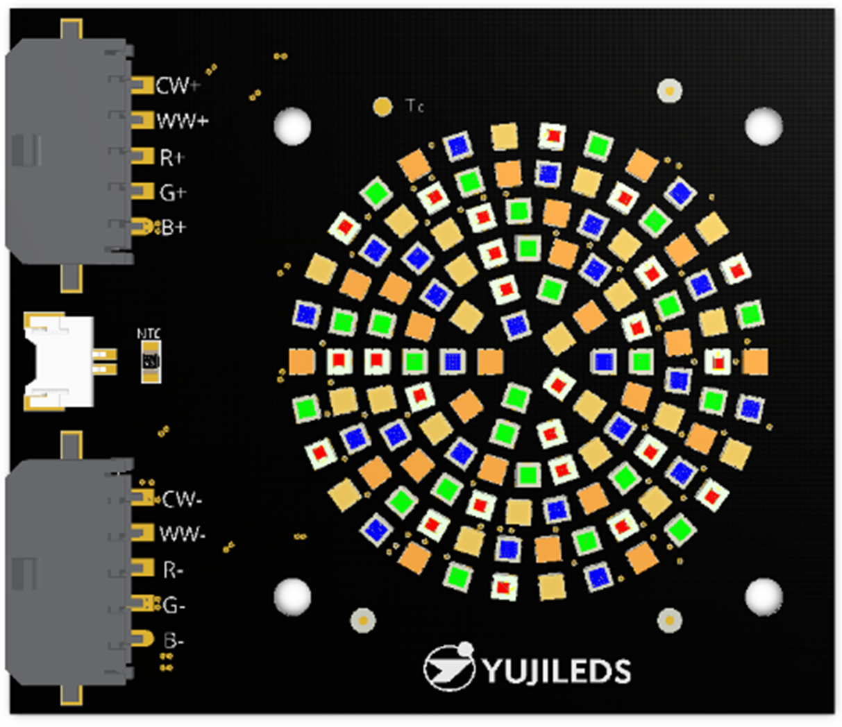 Yujileds® Matrix aims to provide high-density illumination with high-performance white, tunable-white light and full-color lighting options for a variety of applications that require focusing light, accurate chromaticities and excellent color rendition. The Matrix is developed based on the purpose of simplifying the optical design with the small Light Emitting Surface (LES) to accomplish the spectra mixing.