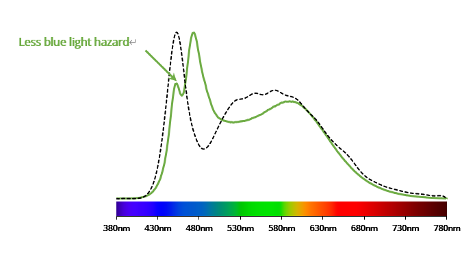 The tailor-made spectrum increases the 480nm and reduces the 450-460nm energy which is recognized as the main wavelength of blue hazard, therefore the Yuji Lighting Well24 Day™ series is not only helping with concentrating, but improving the healthy lighting simultaneously.